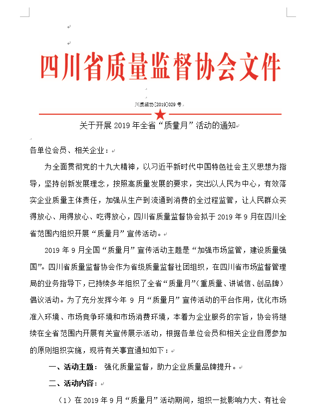 关于开展2019年全省“质量月”活动的通知